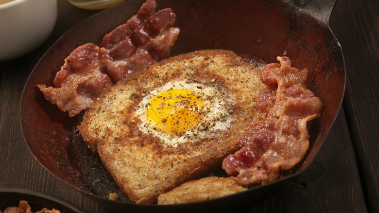 Hobo eggs can sound like a deceptive food name, but it's one of many names for a sunny-side egg fried in buttered bread with a hole cut out. A delectable combo of two iconic breakfast favorites, "hobo eggs" is a moniker from the past that today can be interpreted as insensitive to itinerant people. The first mention of its recipe appeared in 1896 in Fannie Farmer's influential cookbook, "The Boston Cooking-School Cookbook," which Farmer dubbed "eggs in a hat."