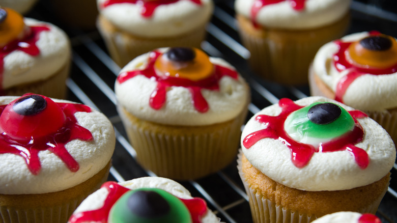 Nikk Alcaraz reaches for clear piping gel when it's time to whip up a batch of edible blood. This ingredient is known to add luster to decorations and frosting, but it just as easily can give your blood that oozy texture that makes it look hyper-realistic. From there, Alcaraz mixes the piping gel with cornstarch to thicken it, as needed, and will also add food coloring to it to give it that unmistakable bloody shade. Alcaraz uses burgundy-colored dye for the blood, but he will also add a hint of green dye to the recipe to help balance out the colors and prevent it from getting too dark. He also shares that you can repurpose your leftover piping gel to add color and shine to the eyes of the cake, as well.