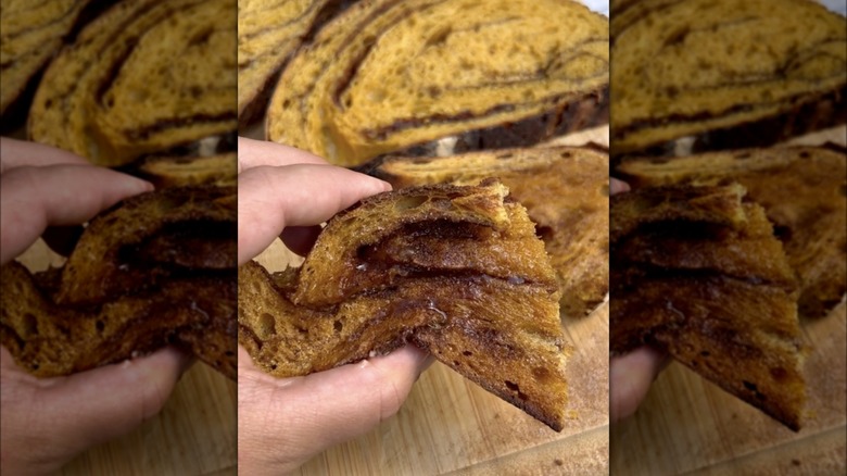 This recipe, which has gone viral on social media apps like TikTok, is easier to make than you may think. It starts with 200 grams of pumpkin puree, combined with all the typical sourdough ingredients, including a well-fed sourdough starter, bread flour, salt, and water; though some folks will also add maple syrup to the recipe for a sweet flavor. Once the sourdough has risen and doubled in size, it can be rolled out and folded up with a cinnamon sugar mixture. This will give you beautiful cinnamon layers, which complement the flavor of the pumpkin well. Once the bread is properly rested, it can be baked off until it's crunchy, sweet, and oozing with pumpkin flavor.