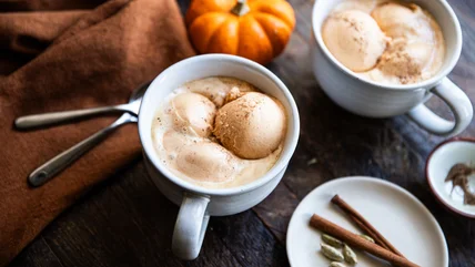 To give an affogato a decadent autumnal makeover, swap vanilla ice cream for spiced pumpkin, add caramel sauce, and top with a final sprinkle of pie spices.