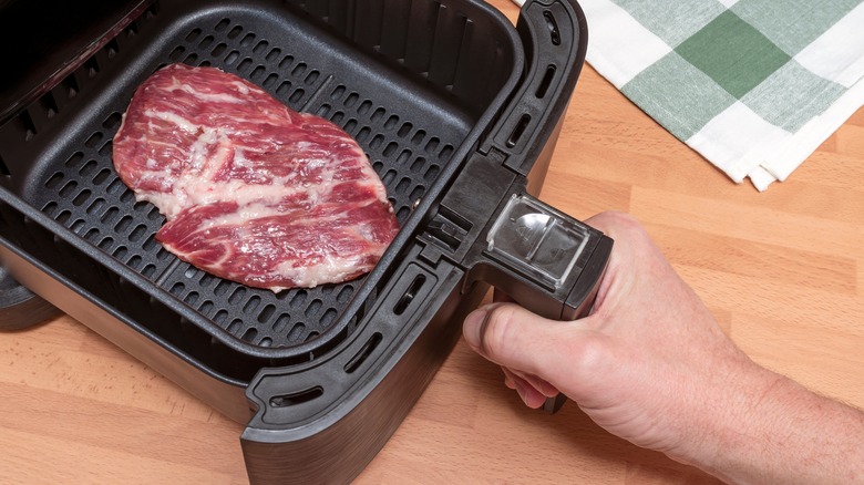 Since steak takes longer to cook on the grill, the cut's subcutaneous fat liquifies with the heat and has time to render off. But with the quick cooking times listed above, this likely won't be the case for air-fried steak. The simple step to take before air frying your steak to ensure you don't end up with tough and chewy bits of fat coating your steak is to chop off any area of fat you can see prior to cooking the meat.