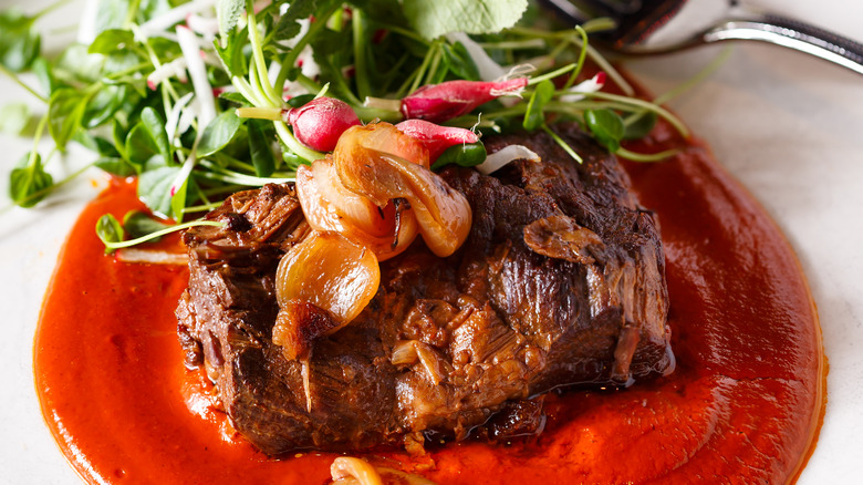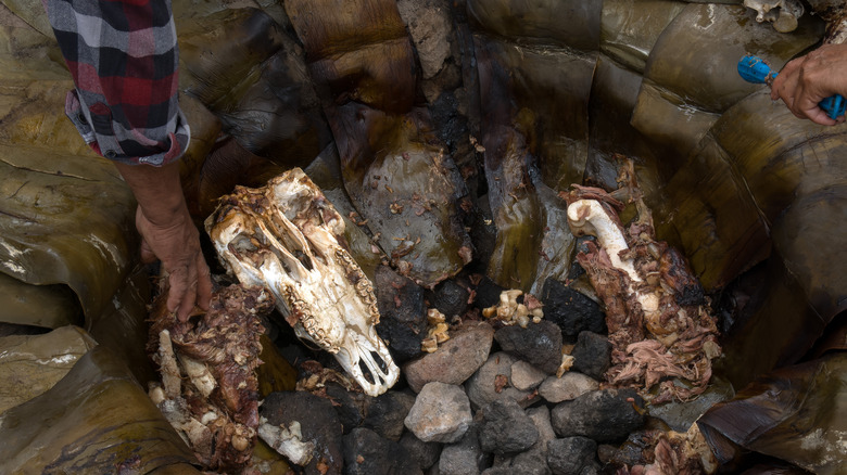 "I always recommend people have [barbacoa and birria in Mexico]," he says. "Because being able to do so, especially pit-cooked barbacoa, in the United States is almost impossible." Bayless goes on to explain that barbacoa in central Mexico, which is often made with lamb, is cooked in open pits. In Oaxaca, you can expect to see this meat coated in a tasty, red chile marinade. In comparison, the barbacoa that you'd find in central Mexico, which includes Mexico City and northward, is made without a marinade; it uses salt and avocado leaves instead. These leaves, Bayless explains, are kept on the branches — which is clearly hard to replicate in an indoor kitchen.