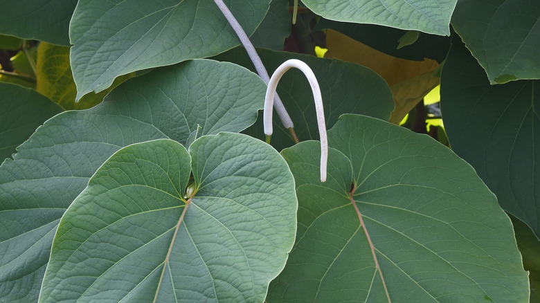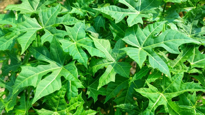 Bayless shares that there are three primary ways that chaya is used. The first is for agua de chaya, a smoothie-esque beverage, and the second is as a flavorful addition to scrambled eggs. The last application is in brazo de reina, which he shares is often translated to "queen's arm" because, well, it's about as big as your forearm. This tamal-like roll is stuffed with chaya and masa and seasoned with ingredients like hard-boiled eggs and pumpkin seeds.