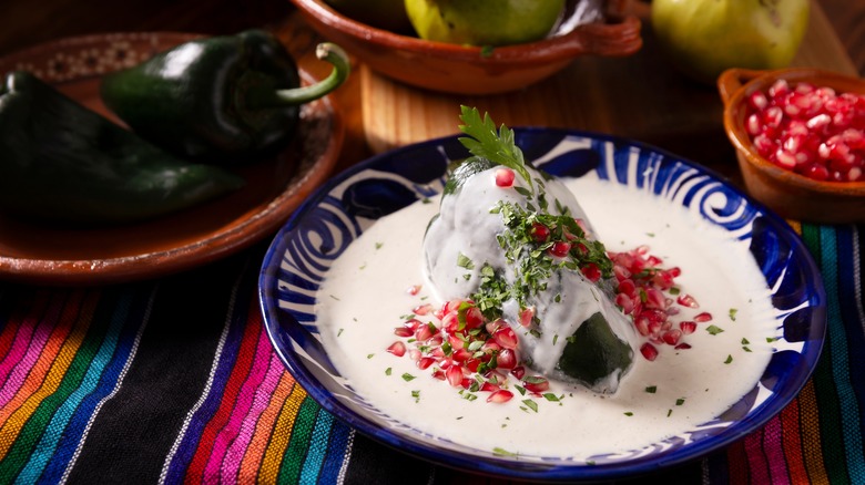 This dish has all three colors of the Mexican flag: green from the pepper, white from the sauce, and red from the garnish of pomegranate seeds on top. The unique ingredient in the sauce that sets this dish apart is fresh walnuts. Now, these aren't the stale walnuts that may be sitting in the back of your pantry as you read this; these are fresh enough that you can peel the brown skin off of the fresh walnut meat. Bayless explains that these fresh walnuts, which have created a huge cottage industry and demand in Mexico, help to create the bright white color of the sauce.