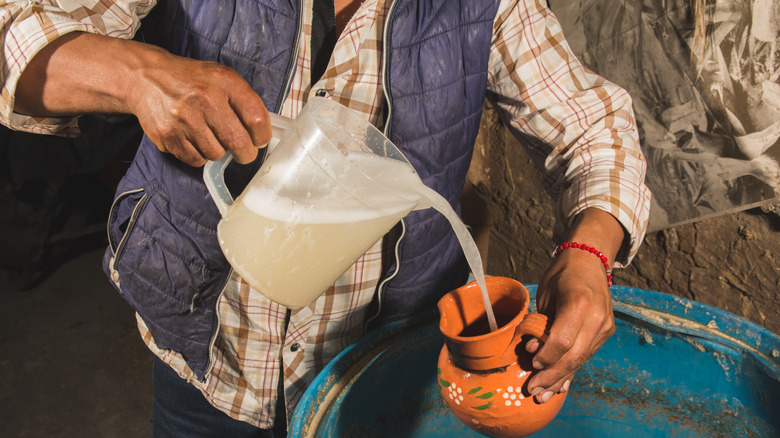 Every culture has its own dishes, and its own alcohols. In Mexico, the apple of Rick Bayless' eye is pulque. This ancient Mexican agave drink is beer-like, per Bayless, and is sourced from a mature agave plant. Mexican spirits experts will know that it's not the same as the popular tequila or mezcal, which are sourced from the heart of the plant. Rather, pulque comes from the sap of the agave, which is called aguamiel.