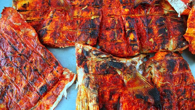 The type of fish can vary for this recipe, though many folks opt to use red snapper, sea bass, or cod for it. The key to preparing this fish dish is to butterfly it correctly. It's important to maximize the surface area so that you can get the perfect amount of seasoning in every bite. Besides the achiote, you'll also find a hint of flavor from the lime, as well as the acidic garnish that it's served with — which may include pickled red onions.