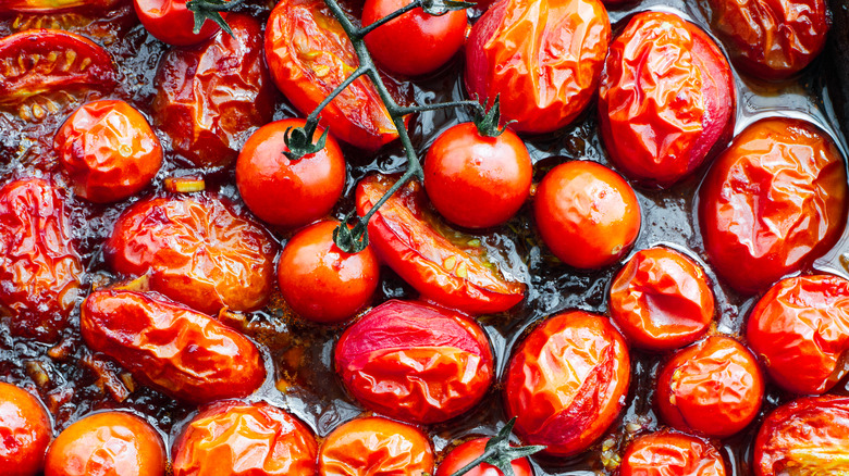If you're new to blistering cherry tomatoes, you'll be glad to hear that the process is fairly simple. One method is to toss the tomatoes in olive oil, spread them on a sheet pan lined with parchment paper, then broil them in the oven "until the skin splits and starts to char," as recommended by Lee. You can also blister cherry tomatoes on the stovetop; simply warm oil in a pan over medium-high heat, add the tomatoes, then let them cook without touching them. After about five minutes, the tomatoes will begin to blister and burst, creating the perfect topping for your risotto. "A little alteration to this is to toss the tomatoes with some lemon zest or garlic, maybe basil leaves, to really enhance the overall flavor," says Lee.