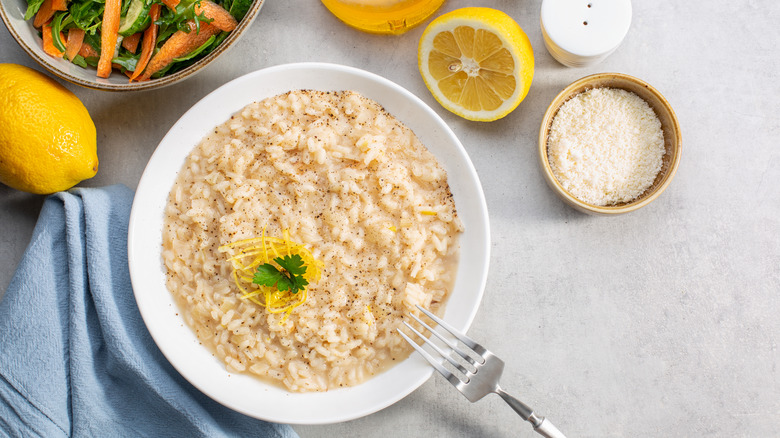 One of the simplest ways to elevate homemade risotto is to incorporate lemon. As Lauren DeSteno notes, more subtle ingredients can get lost in the richness of the dish, but acids can brighten things up. "Lemon is a great ingredient when you want some acid, but not necessarily a highly flavored one, like vinegar, for example," says DeSteno. Jesus Arevalo echoes this notion, sharing that "adding in a citrus to a heartier, rich dish like risotto will also help cut through some of the overpowering fattiness."
