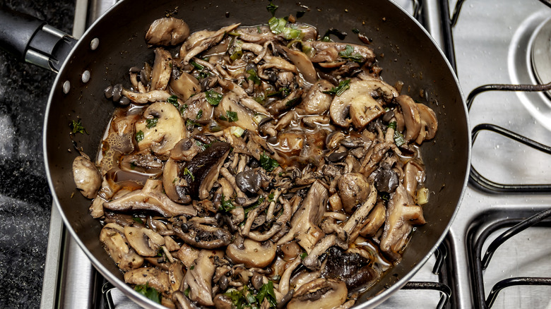 One of the best tips for cooking mushrooms is to dry saute them first; this will help reduce excess moisture. Next, add a bit of oil, then sear the mushrooms until browned, caramelized, and crispy. You can also roast the mushrooms after dry sautéing them on the stovetop. In this case, you'll want to drain the pan after 10 to 20 minutes, which will help them crisp up. However, don't be so quick to toss the liquid, as it can be combined with your broth or stock for additional umami flavor. Once your mushrooms are cooked, mix them into your finished risotto or spoon them on top just before serving.