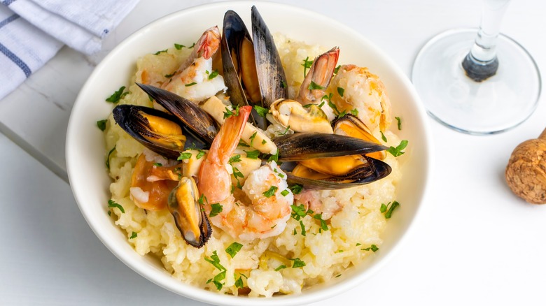 The next time you're making risotto, serve it with your favorite seafood. The combination is so elegant and delicious that you might feel like you're eating at a fancy restaurant. The trick is to add seafood at the end of the cooking process, as this will prevent it from overcooking, says Lauren DeSteno. For instance, consider topping each serving of risotto with cooked lobster or crab meat, as recommended by DeSteno. You can also "saute any raw seafood on the side (when the risotto is nearly ready) in some garlic oil and deglaze with white wine before adding to the risotto," she adds. If you enjoy combining different types of seafood, make a seafood risotto by adding mussels, scallops, calamari, and shrimp in the last few minutes of cooking.