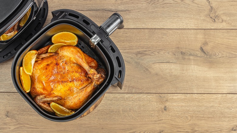Because your skin will be so crispy and the rest of your bird so juicy, you can then slice off legs and breasts and enjoy them exactly as they are. However, you can also shred up your leftovers and use them in a plethora of ways. Shredded poultry makes the perfect filling for taquitos, simplified flautas, lasagna, enchiladas, and empanadas. But it also works perfectly in salads, sandwiches, and soups — specifically, a cranberry and pecan chicken salad, a barbecue chicken sandwich, or a tasty taco soup. However, feel free to get creative here. Pile your leftovers on a buffalo-flavored pizza, stir them into fried rice, pack them into a grilled cheese, or add them into a casserole, after just a few minutes of reheating in the air fryer.