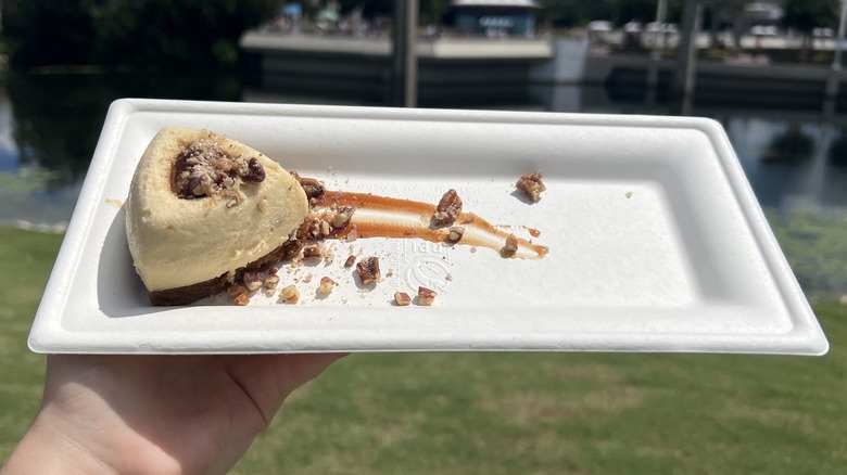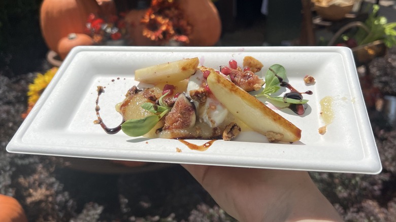Forest & Field caught our attention for its pumpkin ravioli, but there's another cheesy dish worth checking out at this charming new booth. If you're feeling rather full as you approach the finish line of Emile's Fromage Montage, the Burrata with Seasonal Fall Fruit, Spiced Pecans, Apple Puree, and Fig Vinaigrette is a cheat code for easily completing the challenge. This festive fruit salad features wedges of apples, figs, and pomegranate arils dressed with a delicious fig vinaigrette.