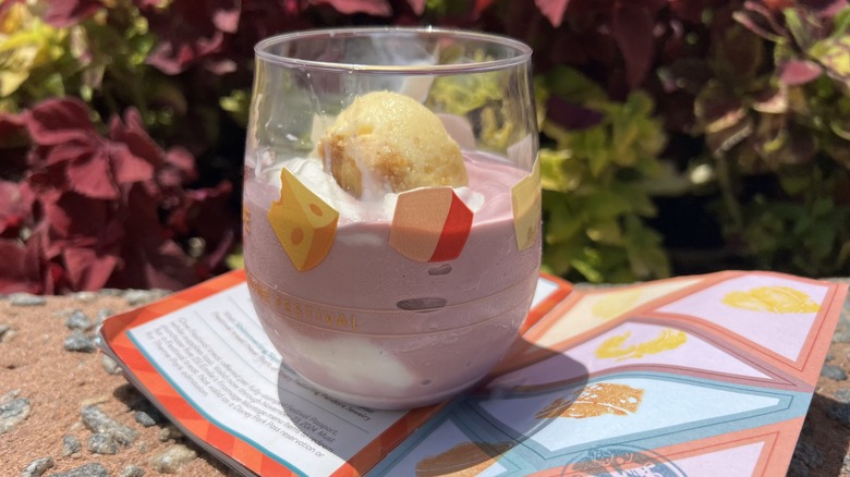 You've bitten into burrata, munched away on manchego, and pulled apart plenty of melted Parmesan during your trek across Epcot. Now, it's time to grab your fifth and final stamp and exchange your passport page for a completer prize from the Shimmering Sips Marketplace. Once you show the cast members at Shimmering Sips all five of your stamps, you'll get Emile's stamp of approval and a special surprise for your efforts: Emile's Fromage Montage Completer Surprise. Emile's Completer Surprise isn't actually a traditional slice of cheesecake, but instead chilly, cheesecake-flavored soft serve.