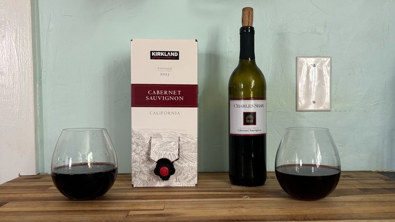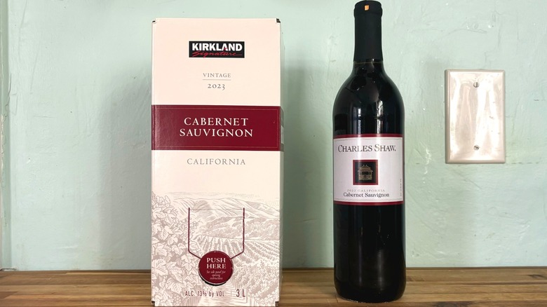 If you've ever looked for value wine, you've no doubt considered trying Costco's Kirkland Signature brand or Trader Joe's Charles Shaw, also known as "two buck chuck." Both brands are known for their affordability — but when it comes to picking a wine, you don't just want to consider the cost. You'll also want to make sure you're getting a bottle of good quality wine. So, which one should you choose? To level the playing field, I opted to try both stores' cabernet sauvignon.