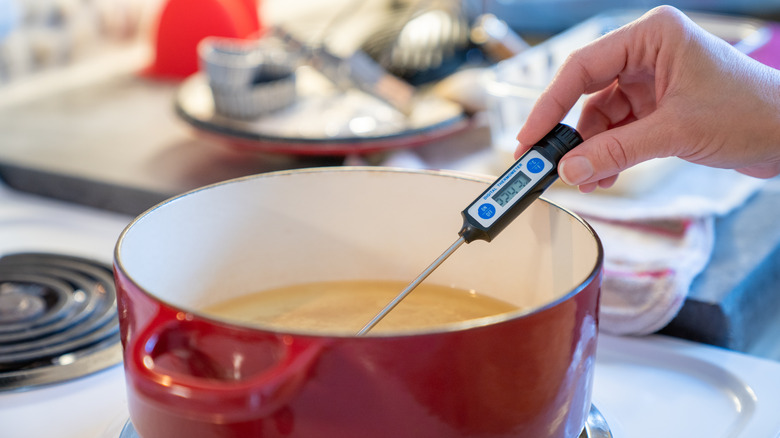To make sure your oil doesn't get too hot nor too cold, a deep fry thermometer or a candy thermometer are essential as they can help you maintain and regulate the temperature of the oil, which should remain as steady as possible. Whether it's digital or analog, the important feature of any thermometer used for deep frying is that it can clip onto the side of the pot and remain hovering in the oil, not touching the bottom of the pot, as that would skew the temperature reading. The thermometer's ability to clip on to the wall of the pot leaves your hands free to tackle the rest of the elements of deep frying and allows you to focus on the task at hand without having to constantly check the oil temperature manually.