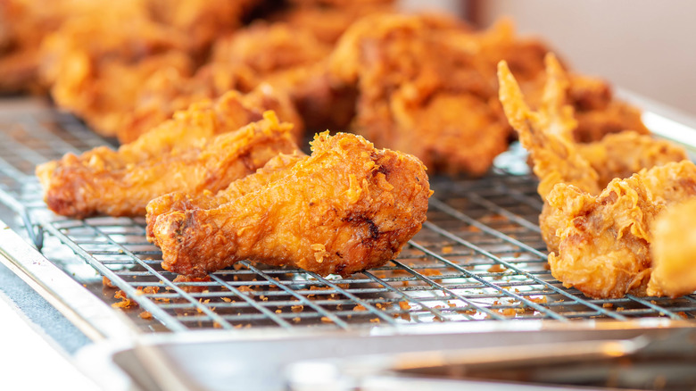 Wire racks are an essential part of deep frying. Imagine putting in all of that work to achieve crisp, craggily edges only to have them get sad and soggy while resting in their own oil drippings while they cool and rest. Thankfully, a wire rack is an easy solution to keep fried foods crunchy as it suspends the food in midair and allows any remaining oil to drip off. For easier cleanup, place a layer of paper towels between the sheet pan and the wire rack to catch excess oil drippings.