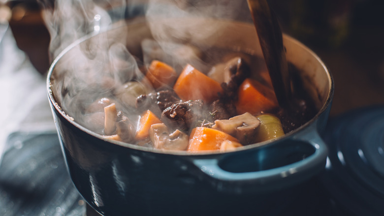 As such, you don't want to skip this important step in making your next beef stew. As for how, exactly, to cook those vegetables, follow Garten's lead and grab two bottles of liquor. She uses a combination of Cognac and red wine, heating the duo for roughly one minute before adding her vegetables. The alcohol deglazes the pan and keeps the flavor coming, building up to the final stew. After all, a good stew melds various flavors and textures, combining meats with vegetables — all perfectly tender.