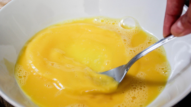 The main component that sets egg drop soup apart from wonton soup and other brothy Chinese dishes is the use of eggs. The Chinese term for the dish even translates to something like egg flower soup due to the ingredients and technique used to pull it off. The eggs aren't scrambled or boiled and used as a garnish, however. The trick is for the raw, beaten eggs to be whisked or swirled into the broth, which should result in a silky consistency if done correctly.