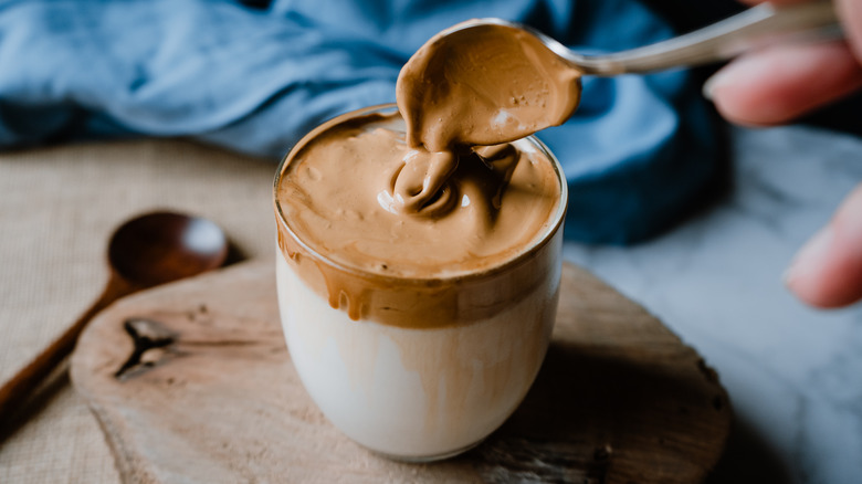 Simply whisk cream, cocoa, and powdered sugar — or hot cocoa mix and cream — with a mixer. Just as if you were whipping yourself a Dalgona coffee, peaks will form after a few minutes, but depending on whether you're using a machine mixer or attempting the process by whipping the ingredients with a handheld whisk, the noticeable change in texture can take longer. Keep in mind that including powdered sugar in your mixing bowl can result in a faster whipping process. If you use granulated sugar, you might be whipping the chocolatey compilation for longer than you had planned.