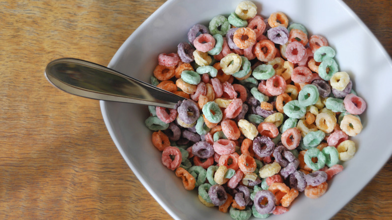 If you feel like your tres leches cake could stand to have a bit more fruit flavor added, you can get creative with Fruity Pebbles or Froot Loops-infused milk. For something even sweeter, try Lucky Charms Just Magical Marshmallows, available on Amazon, which will make an extra sugary addition to your milk. If you'd like to introduce a more chocolate-forward flavor, Count Chocula cereal is especially prevalent around the Halloween season and beyond. However you choose to level up your tres leches cake, it will be more than three times as delightful!