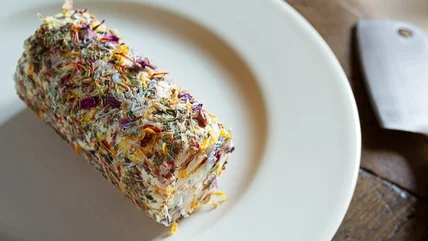 The sky's the limit for what to roll your goat cheese in. Think about your own personal favorite flavor combinations, seasons, and other things you want to serve on the board. Get to know edible flowers and how to use them to feel inspired on which ones to use — pressing them on here is just like working them into compound butter. Herbs work just as well as flowers, or alongside them, too. For things like fruits, avoid ingredients that have a lot of moisture, as they won't stick well and will make the whole log mushy, and if you want to use crispier fruits like apples, chop the slices up so they're more like sweet, crunchy little shards. Dried fruits work best, and nuts are easy and delectable.