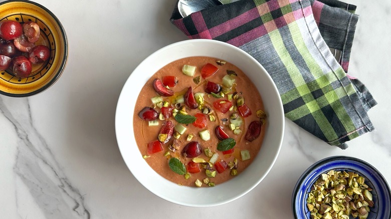 The thought of cold soup is off-putting to some, but the dish known as gazpacho can actually be refreshing and filling any day of the year. Despite the dish's Spanish roots, there are many variations with influences from cuisines around the world. Tomatoes and cucumbers are mainstay ingredients in a classic version of gazpacho, but there's a strong case to be made for giving the soup a Moroccan — and slightly sweet — touch with cherries.