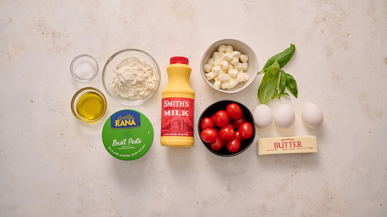 To make any Dutch baby, you'll need flour, eggs, whole milk, salt, and butter. Make sure that your ingredients are room temperature before starting. To make this a Caprese Dutch baby, you'll also need basil pesto, which you can buy pre-made or make from scratch, mozzarella pearls, cherry tomatoes, olive oil, and a few leaves of fresh basil.