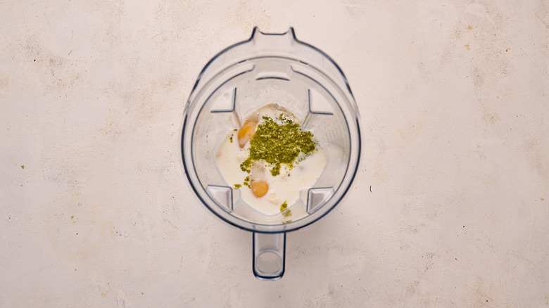 - Combine the eggs, flour, milk, salt, and pesto in a blender.