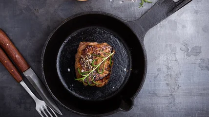 Given these attributes, you'll also want to choose foods that cook well on high, consistent heat. Meat, especially, thrives in cast iron pans, which is why they're great for searing steaks. Stir-fry recipes and ultra-crispy vegetables also fare well on the material for the same reason. You just may want to buy a pan handle cover (they come in leather as well as washable silicone) so you can endure the heat of the metal when holding it.