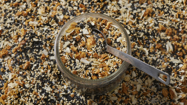 Whether you choose to make your own everything bagel seasoning blend or grab a pre-mixed portion such as Newman's Own Everything Bagel Seasoning from Amazon, your sandwich will benefit from the combination of garlic, poppy seeds, sesame seeds, onion, and salt. If you prefer to make your grilled cheese with an actual bagel, you can do so by inverting the sliced halves so that the seasoning on top doesn't spill out. For a more traditional take on a grilled cheese sandwich, there are plenty of ways to add everything seasoning.