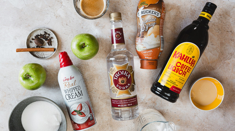 You'll need a few ingredients that blend sweet, spicy, and coffee flavors for this creamy cocktail. For the spiced apple syrup, grab Granny Smith apples, water, sugar, and a selection of warm spices including cinnamon, nutmeg, allspice, and cloves. For the martini itself, you'll want caramel sauce, vodka, chilled espresso, Kahlua (or another type of coffee liqueur), condensed milk, and your homemade spiced apple syrup. And don't forget the whipped cream for topping!