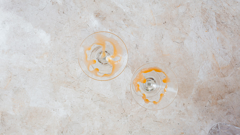 - Drizzle half of the caramel sauce inside 2 chilled martini glasses.