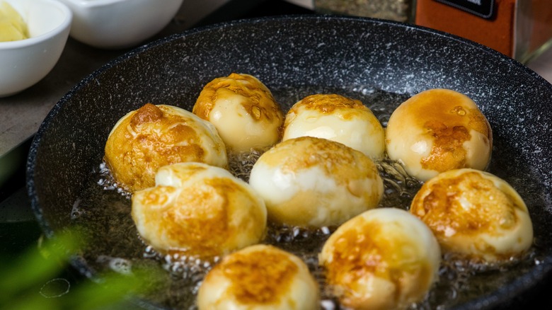 Fry the hard boiled eggs for around two to three minutes. Move and turn them until you've achieved browning and bubbling around the surface of the whites. If you want to develop even more flavors, you can add aromatics or sauces to finish the eggs off.