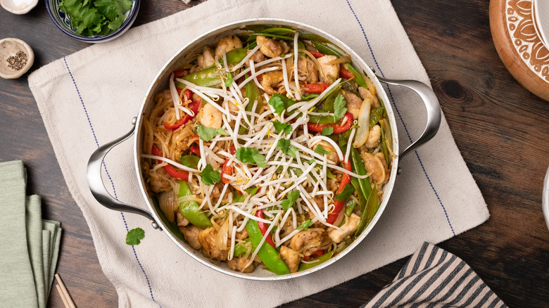 This recipe's stir-fry sauce includes both orange and lime for a huge hit of citrus, and that coats a medley of chicken thighs, rice noodles, and vegetables.