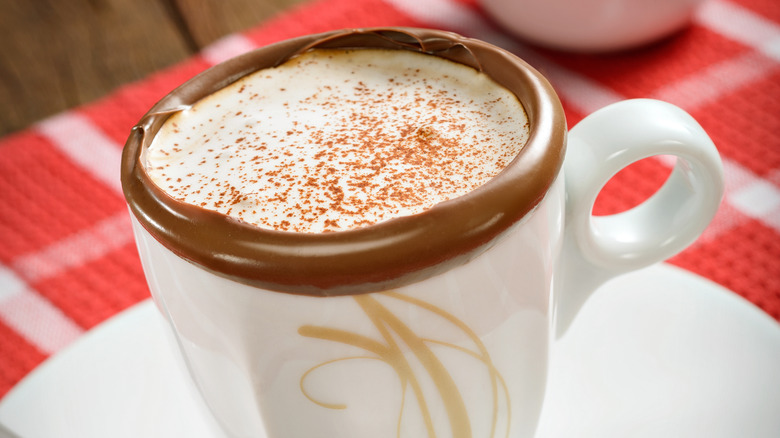 A chocolate rim is a no-brainer for hot chocolate, but it will add more indulgence to many drinks, including coffee lattes, chai lattes, and even mulled wine, or Irish coffee. You can do an easy chocolate rim with chocolate sauce, or for a hard chocolate rim, you can use melted chocolate and then chill your glass/cup. Add the liquid chocolate (whether it's melted chocolate or sauce) to a flat plate and then turn your cup upside down and press it into the chocolate, making sure the chocolate is all over the circumference of the cup. It doesn't have to be incredibly even, as any parts with excess chocolate will drip a little and look even more yummy.