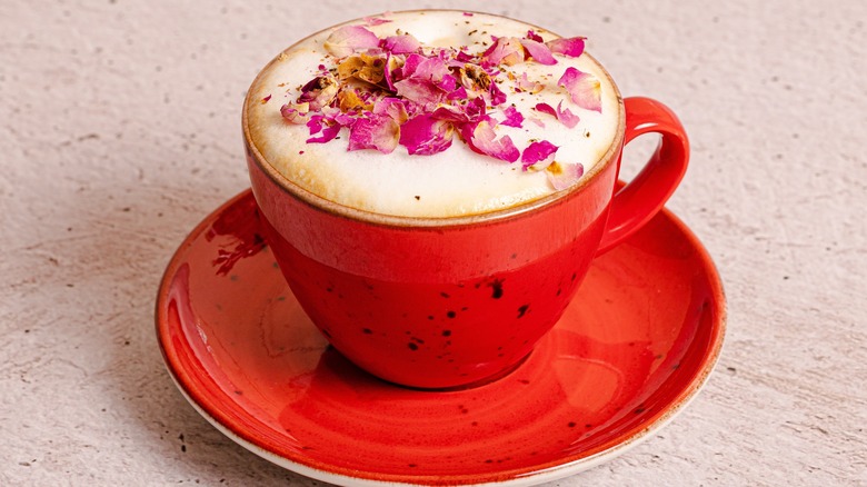 As someone with North African heritage, I'm intimately familiar with edible roses and rose-flavored foods. Rose water is a staple in my pantry to flavor syrups for desserts, and many other uses. Along with rose water, I always keep a jar of dried, edible rose petals in my pantry to use for decoration. They're dramatic and oh-so-beautiful, sprinkled onto baked goods and hot drinks. I love making a rose latte and adding some rose petals on top for a striking cup of rose-scented coffee. Rose and coffee make for an incredibly perfumed flavor combination, and you can easily make a rose latte by adding a drop or two of rose water to your regular latte, or even melting a piece of rose Turkish delight into your cappuccino.