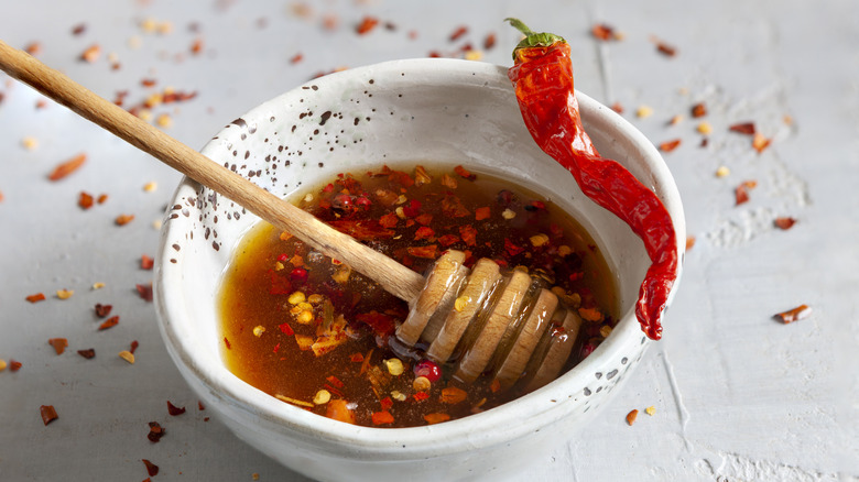 Hot honey has been all the rage for the last couple of years, and it's so good, the hype isn't dying down anytime soon. The balance of spiciness and sweetness mellows out the extreme ends of both flavors, making tangy, sweet, and hot liquid gold. It's an obvious topping for fried chicken, biscuits, pizza, and even ice cream, but it's also a great garnish for a tasty hot drink. If you love spicy foods, you're bound to love spicy drinks, too. You could even make a fancy hot honey rim with extra chile flakes for a hot toddy, or enjoy it with some hot apple cider.