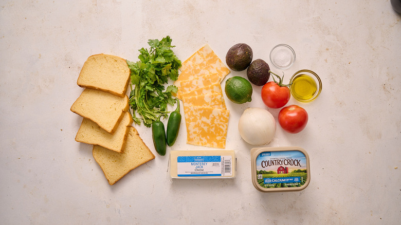 To first make the pico de gallo, you'll need a few tomatoes, white onion, cilantro, lime, salt, and olive oil. Choose a dense tomato like Roma or vine, which won't be as watery as beefsteak or heirloom. From there, you'll need thickly sliced bread like brioche, spreadable butter for toasting, Colby-jack cheese, Monterey Jack cheese, jalapeños, and avocado.