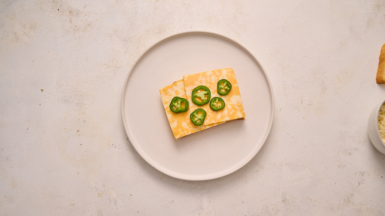 Add 4 to 6 slices of jalapeño to the cheese.