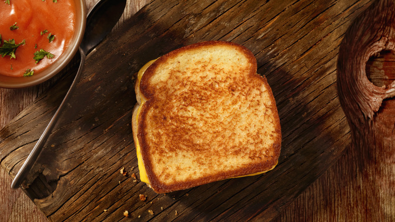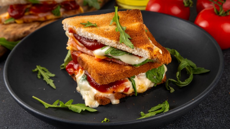 As for how to cook the pizza-inspired grilled cheese, use your go-to technique for a regular version of the sandwich. That means it can go into a pan on the stovetop, in your panini press, or on a baking sheet in the oven, depending on your preference. Just make sure you don't overcook the sandwich if you have cheese or toppings on the outside of the bread. If you've got the time and inclination, finish things off with even more grilled cheese hacks like swapping out the butter for mayonnaise or using a blend of your favorite cheeses.