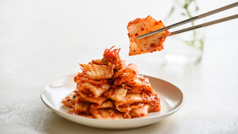 There are all different kinds of kimchi you can go for here, as this term refers to a classic Korean side made from fermented veggies. But for the purposes of jazzing up your barbecue sauce, opt for baechu kimchi, which uses napa cabbage and is the most common variety in the U.S. Aside from the main ingredient, it's made with salt, Korean radishes, Korean fish sauce, garlic, ginger, scallions, and gochugaru (aka Korean chili powder), although there may be other additions as well. This means that when you incorporate it into your barbecue sauce, you'll get plenty of umami, tangy, and spicy flavors. On its own, barbecue sauce is already full of sweetness (often thanks to ketchup and brown sugar inclusions), so this condiment is ideal for providing contrast and flavor notes that pop.