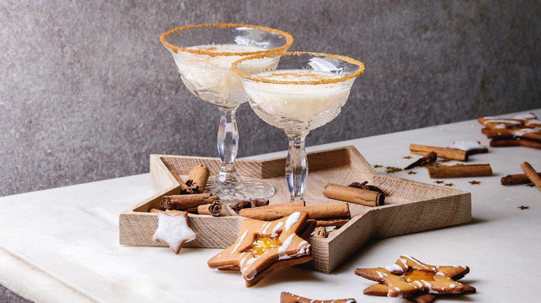 There are plenty of options for a cinnamon sugar rim — just think about what drink you'd like to accent with spiced sweetness at every sip. A natural fit is a boozy apple cider recipe with whiskey, apple juice, and sparkling hard apple cider. Here, you wet the rim with lemon juice, adding a hint of brightness to temper the sugar. Or, there's the modern classic cable car cocktail: spiced rum with orange liqueur, lemon juice, and simple syrup. The cinnamon sugar rum highlights the spices in the rum. Speaking of spiced rum, there's also the spiced rum cake holiday cocktail, which incorporates almond bitters and allspice dram and is a great contender for a cinnamon sugar rim.