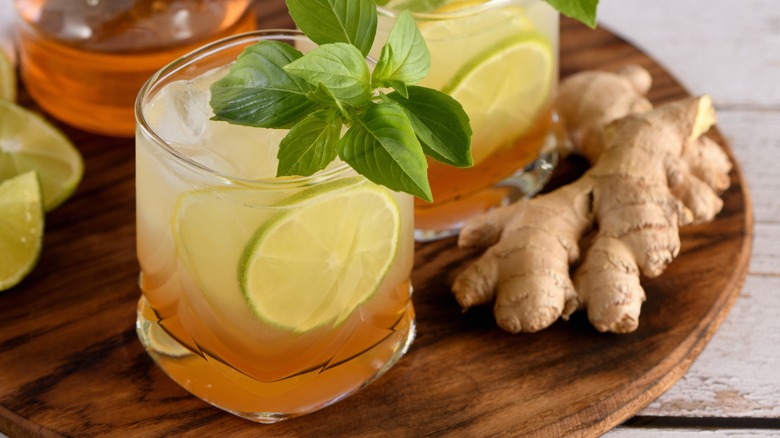 If you don't want to wait for your ginger syrup ingredients to sit overnight, you can also whip up a simple version on the stove. You'll want to peel and slice or chop a ginger root — but don't grate it, since it could slip through a strainer later on. Then dissolve twice as much water and sugar in a pot on the stove, toss in your ginger, and bring everything to a boil. After up to an hour of simmering, strain everything and let it cool down. To whip up a spicy, earthy margarita, add 1 ounce of your syrup into the shaker instead of another sweetener. If you want to go with a ginger liqueur, however, use 2 ounces for every 2 ounces of tequila.