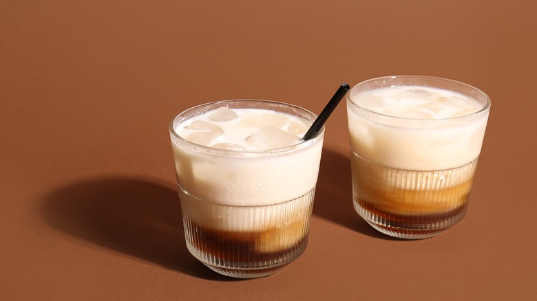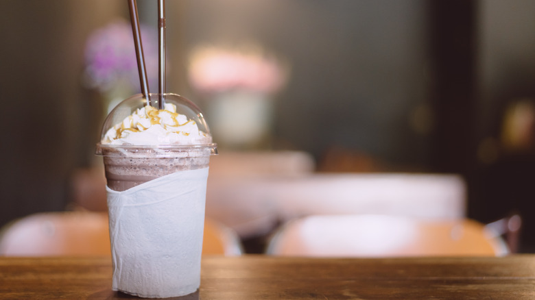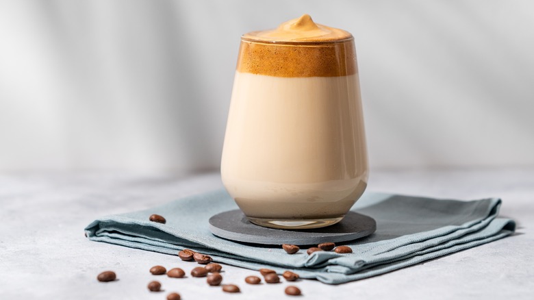 Simply reach for instant coffee, water, and sugar, and get to whipping as you did when you first learned about the viral recipe. Once the mixture has plumped up in texture, you can mix milk or your choice of milk alternative with two or three tablespoons of malted powder. Lovers of the stuff may even decide to add an extra spoonful. To turn your recipe into a chocolate-forward drink, you can also stir in chocolate syrup to this mix before you pour your whipped dalgona mixture into a glass. Alternatively, line your mug with your choice of caramel or chocolate syrup for an added sweet note.