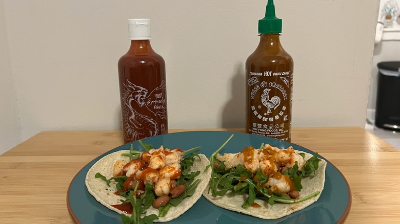 When tasting both sriracha sauces, I wanted to be able to fairly compare the two. First, I tasted each one individually, without any other food involved. I took a big sip of water and cleared my mouth in between each bite, just to make sure I was getting a fair sense of each brand's flavor. Then, I tried the sauces with other ingredients to see how the flavors changed: a plain tortilla chip, a piece of grilled shrimp, and a shrimp taco with beans and arugula on a corn tortilla. From there, I was able to notice different aspects of the sauce's flavorings and was able to make a clear decision on the winner.