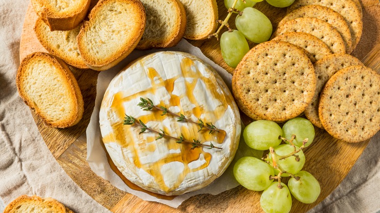 Prepare your brie however you'd like to bake it in the air fryer, perhaps following our fig-baked brie recipe. When it's time to cook, set your air fryer to around 350 degrees Fahrenheit. Although it will typically be done cooking in about 10 minutes, it's best to keep an eye on it to see when the cheese is melted enough and ready to serve. For instance, if you wrap the brie in something like phyllo dough, it might need to stay in for up to 15 minutes to crisp the crust and melt the cheese inside. There's no need to flip or rotate the brie while it cooks off in the air fryer — just don't forget to set a timer.