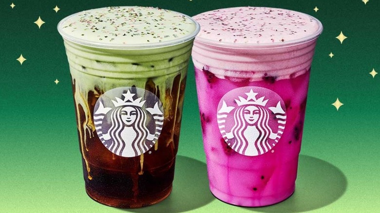 The two Starbuck's "Wicked" drinks feature flavor combos as different as the movie's characters themselves. Glinda's Pink Potion is a Mango Dragonfruit Starbucks Refresher that is shaken with coconut milk, ice, and freeze-dried dragonfruit. Then, the pink explosion that Starbucks' beverage developer Natalia Vasquez calls "as vibrant as Glinda herself" goes even further, getting topped with nondairy strawberry purée-infused cold foam and pink candy sprinkles. Meanwhile, in the West, Elphaba's Cold Brew is made with Starbucks' custom Cold Brew blend and sweet peppermint syrup. It's then topped with green nondairy matcha cold foam and matching candy sprinkles. Vasquez says the drink was "inspired by Elphaba's bold energy and stunning green skin."