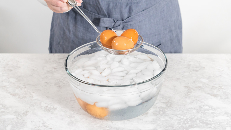 Something else worth knowing? Shocking the eggs with an immediate ice water bath gives your eggs a better shape. Unlike just using cold water and a gradual cooldown of the eggs, using ice water to shock the eggs quickly changes all the steam inside the egg into water. With the water taking up less space than the steam did, it gives the still-soft egg white a chance to fill in the space where the air pocket once was, making it smoother rather than dimpled as the egg white hardens. However, the hardening part is important. So, you want to leave the eggs in the ice-cold water for at least 15 minutes to give them time to harden so that they're easier to peel. They'll peel even better if you leave them in the fridge overnight.