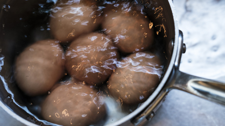 Counts explains how she uses this method for boiling eggs. "I start them completely submerged in cold water," she says. "Once the water and eggs reach a full boil, I cook them for nine minutes." Nine minutes is less time than eggs take to boil when you drop room-temperature eggs into boiling water. But remember that the egg is starting to cook as the water gets up to the boiling point. However, if you don't watch the water, you might miss the moment it starts boiling and end up boiling the eggs too hard or overcooking them. So, you've got to stay vigilant with this method.