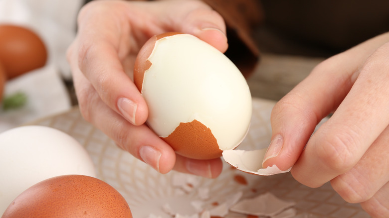 Chef Lisa Counts relies on one specific method. She says, "After cooking, I like to lightly crack my cooked eggs all over their surface, gently rolling them on my counter to create what looks like spider veins in the shell. Then starting on one side, I peel them from top to bottom, creating a line on one side, and then peel the rest of the shell off. Doing this process under running cold water helps, too." Chef Matt Finarelli uses another peeling method after cooking his eggs in an Instant Pot. Just "tap on the fat end, and then peel the shell off in a spiral around the egg."